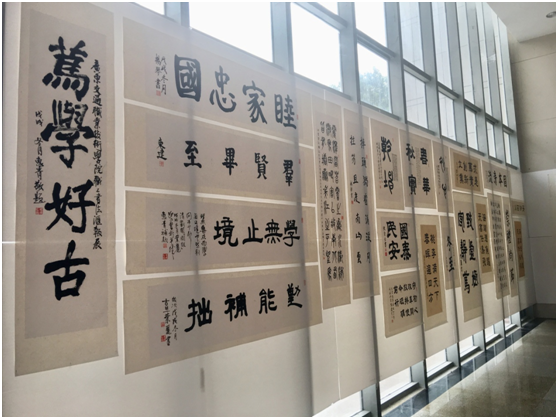 在图书馆一楼大厅,整齐展示着老师们的书法作品,这些作品主要来自于书法学训班的老师和学员们。学员们经过这个学期的学习,尽情挥毫泼墨,自由发挥,不仅体现了书法的魅力和独特风格,也包含着作者的文化修养和心灵内涵。书法作为一种文化,一种精神,给师生们一种赏心悦目、涤荡心灵的美的享受,同时给我们的校园营造出积极向上,清新高雅,健康文明的校园文化氛围。