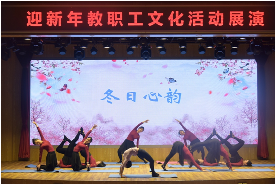 学术报告厅内,老师和学生们以饱满的热情和高度认真地态度,在舞台上展演节目。歌曲类的合唱、小组唱、独唱等曲目既有歌颂祖国改革开放的《走进新时代》、《春天的故事》,也有反映中国革命历程的《映山红》、《九儿》、《驼铃》等;动静结合的集体瑜伽,动作整齐轻柔、流畅优美,给大家带来内心的宁静和舒适,感受到真正的大爱和甜美的甘露;青春飞扬、动感十足的尊巴健美操,活力迸发,冲击力很强带来了别样美的视觉盛宴;中华文化经典《诗经》、《大学》诵读,让大家对传统文化有更深的认识和理解。大家一边重温体验着老师所教技巧,一边用心用情感受改革开放带来的美好的生活,甚为开心惬意。最后活动在《难忘今宵》的大合唱中落下帷幕。