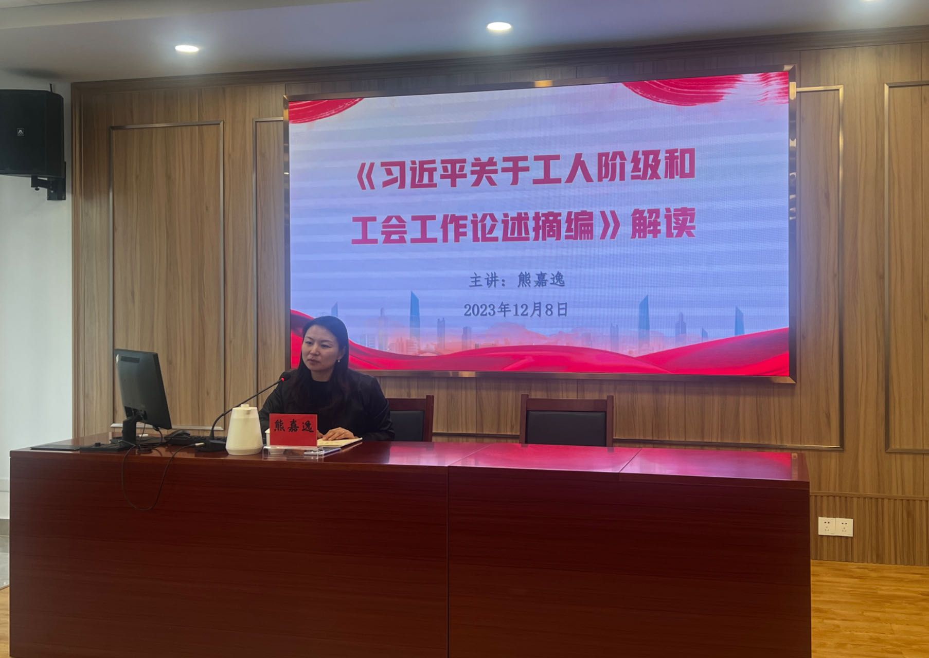 学院工会主席、副院长熊嘉逸以《<习近平关于工人阶级和工会工作论述摘编>解读》为题带领大家读原文、悟思想,她要求工会干部全面学习贯彻习近平新时代中国特色社会主义思想,深入贯彻习近平总书记关于工人阶级和工会工作的重要论述精神,贯彻落实中国工会十八大精神,坚持党的领导,深化工会改革和建设,加强职工思想引领,推进教职工队伍建设,加强维权服务,构建和谐劳动关系,调动广大教职工群众的积极性、主动性、创造性,组织动员教职工群众为学院的高质量发展献计献策、添砖加瓦。