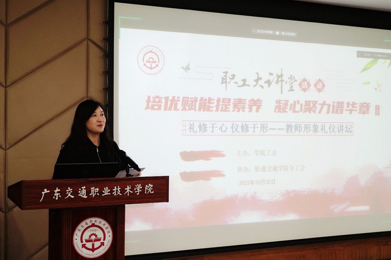 教师礼仪,是教师从事教育教学活动履行职务时重要的行为规范。为全面提升学院教师形象礼仪素养,塑造师者风范, 10月30日下午,由学院工会主办、轨道交通学院分工会承办的交院职工大讲堂——《礼修于心、仪修于形》教师形象礼仪讲座在天河校区2栋101学术报告厅顺利举行,全程同步线上直播。讲座邀请国家注册高级礼仪培训师认证讲师闫仲秋老师主讲。