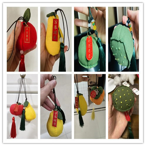 七彩丝线缠香囊,祝福裹满暖心房。香囊又名香袋、花囊。有用五色丝线缠成的,用彩色丝线在彩绸上绣制出各种内涵古老神奇、博大精深的图案纹饰,缝制成形状各异、大小不等的小绣囊,内装多种浓烈芳香气味的中草药。活动组织者为到场的老师准备了艾叶香囊DIY制作套餐,内含柿子、莲蓬、苹果、梨子4种香囊材料包,寓意着柿柿如意、好运莲莲、平安喜乐、好事顺梨。在淡淡的艾草香气中,老师们共同探讨缝制香囊的针法,一针一线将香囊缝合,装满棉球和艾草,最后用彩珠、流苏、寓意挂牌进行了装饰,创作出一个个精致的香囊,散发出阵阵幽香。