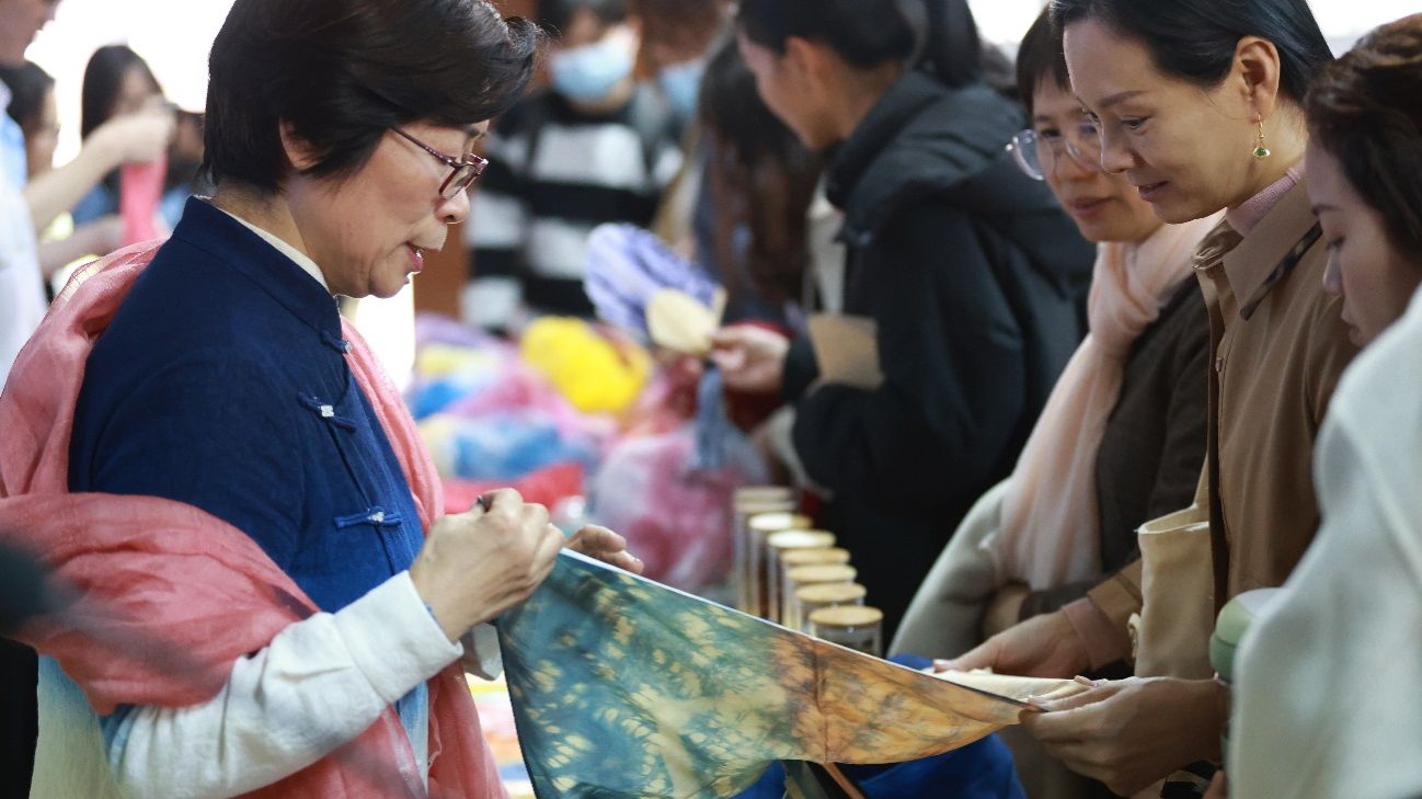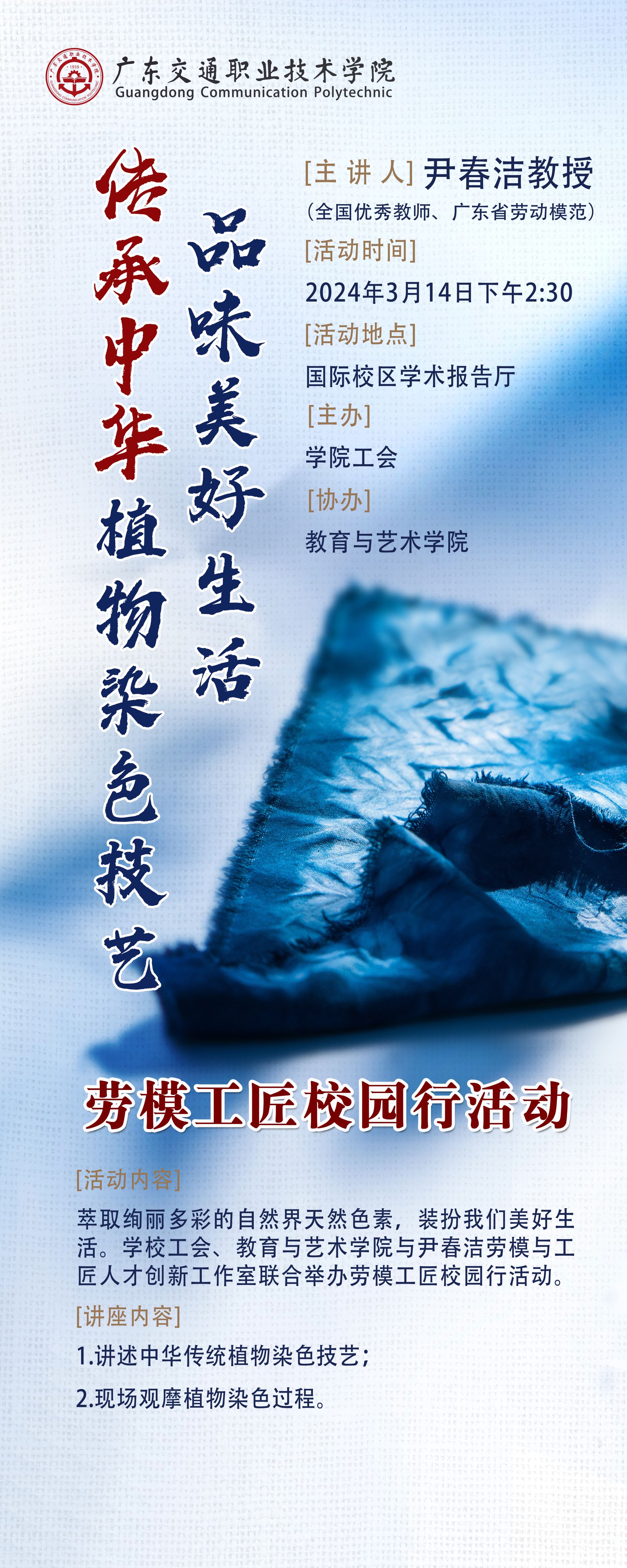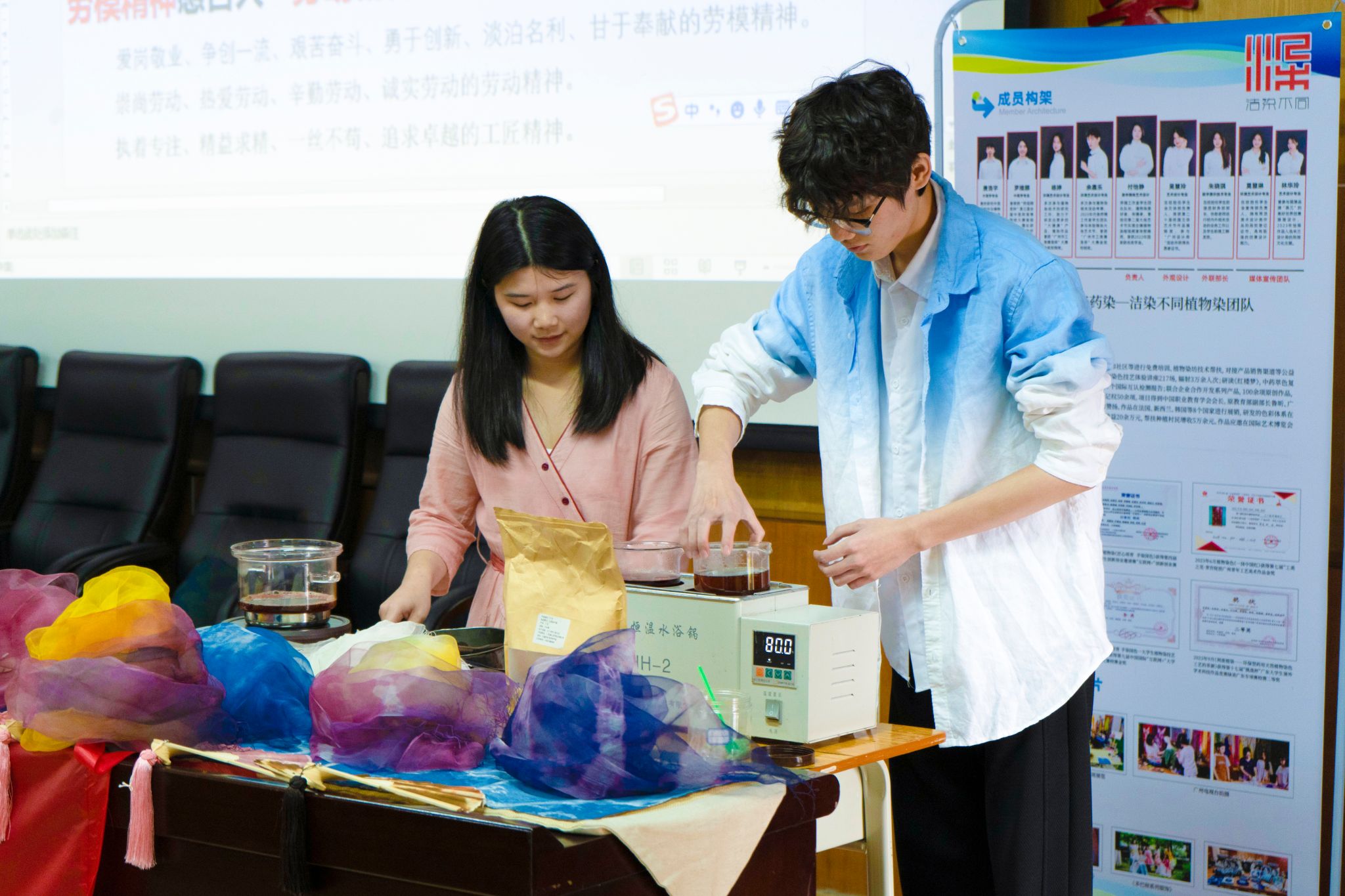 为弘扬劳模精神、劳动精神和工匠精神,传承中华传统植物染色技艺,3月14日下午,学院工会邀请“尹春洁劳模创新工作室”到国际校区开展以“传承中华植物染色技艺,品味美好生活”为主题的劳模工匠进校园活动。学院党委委员、副院长、工会主席熊嘉逸、教育与艺术学院院长罗罕淑、副院长梁准平、姚业华以及120余名师生代表参加了本次活动。