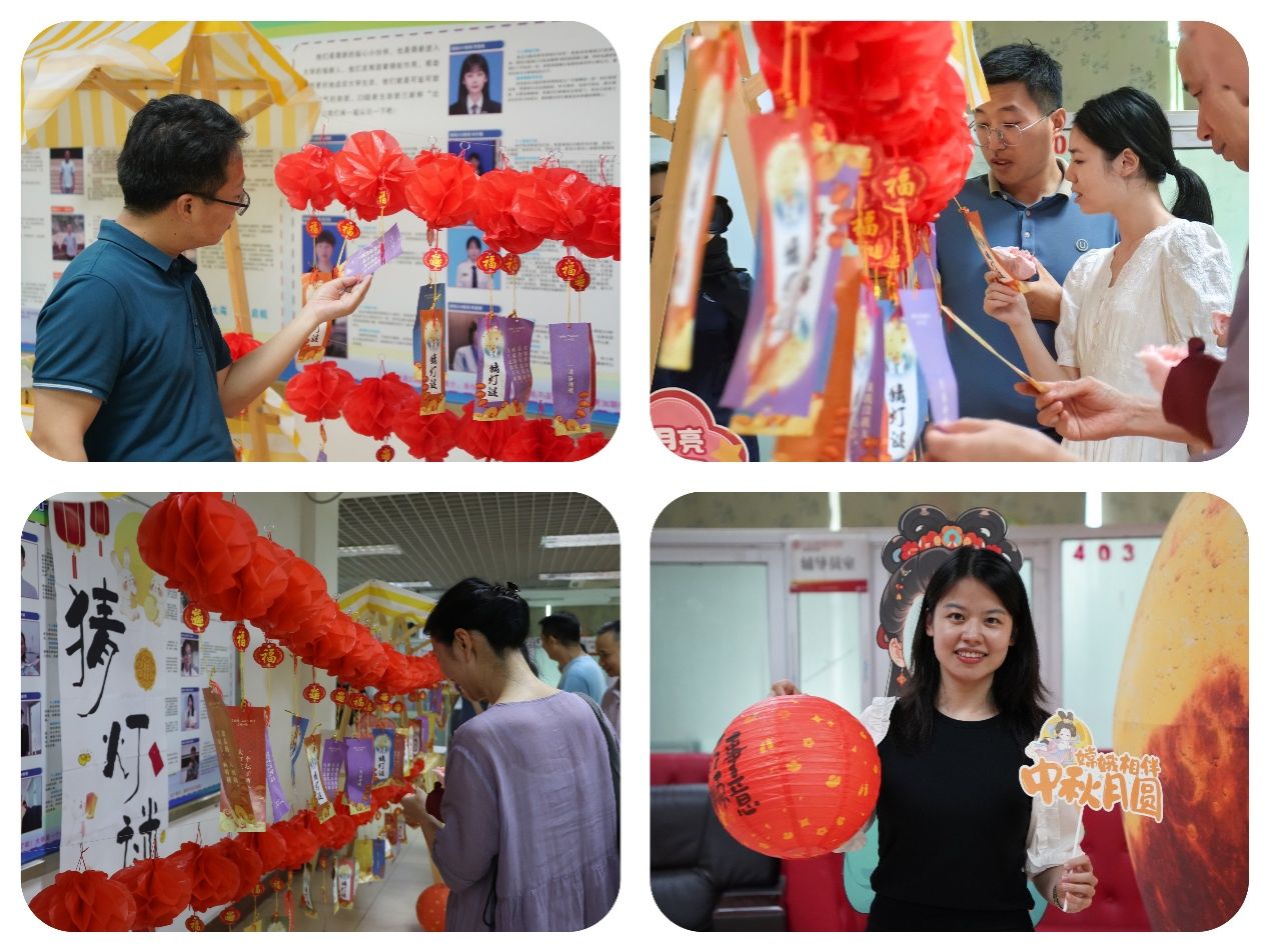 灯色谜趣。在猜灯谜活动中,红色的灯笼高高挂起,下面系着一张张涵盖生活、文化等领域知识的谜面,既考验了老师们的知识面,也增添了节日的互动性。
