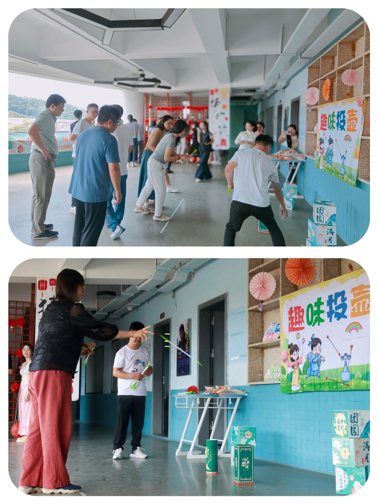 投壶射礼。在投壶活动中,老师们精神抖擞,屏气凝神,瞄准壶口,将箭羽投出,每一次的投中都引发大家一阵欢呼,沉稳的姿态,热烈的氛围,大家都沉浸在这份简单的快乐之中,享受民俗体验带来的乐趣。