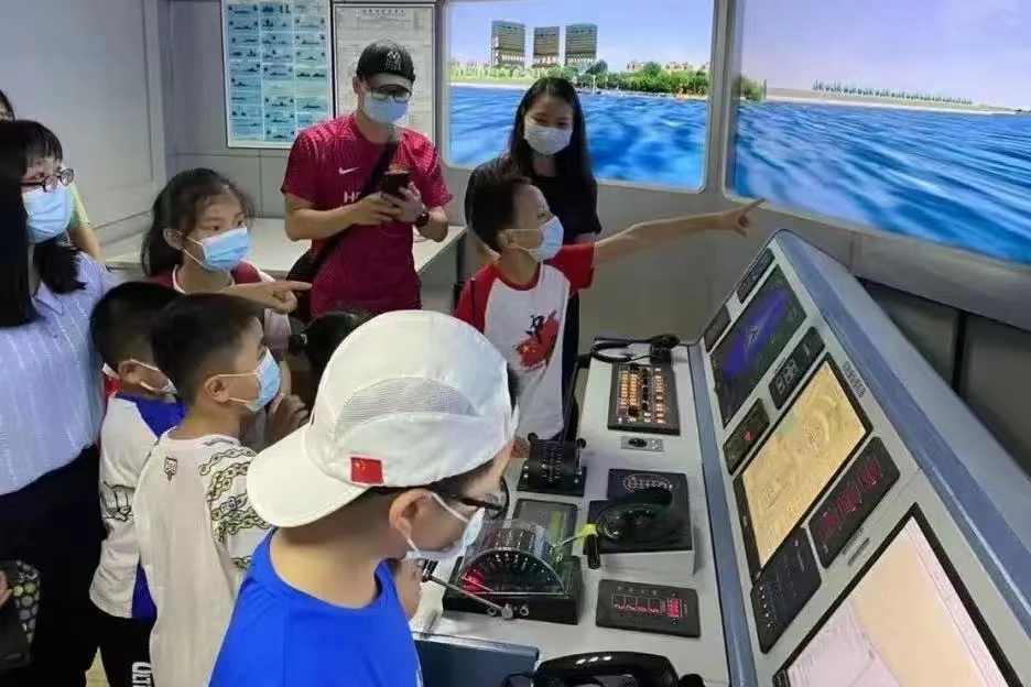 第一站:船舶驾驶体验。在模拟驾驶舱,老师给小朋友们普及了船艇设备、雷达、通讯等航海知识,对船舶模拟驾驶台每个仪器的用法及作用进行了仔细讲解和示范操作。在好奇心的驱动下,小朋友们一个个争当小船长,亲身体验操作,留下了深刻而难忘的印象。