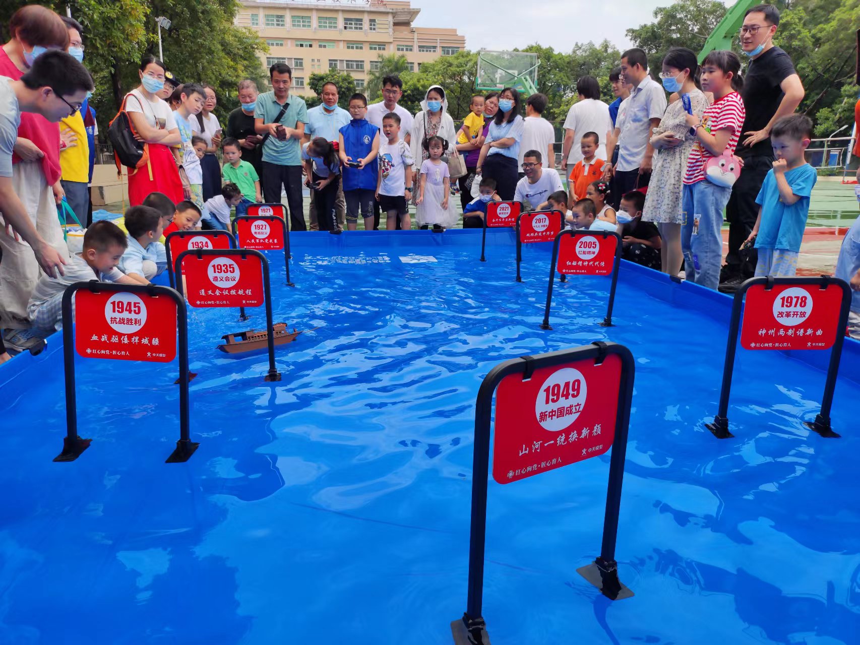 第六站:遥控红船比赛。结合党史学习教育和遥控驾驶船的体验,本活动是让驾驶者遥控红船,按照党的百年光辉历程重要时间节点,通过一个一个历史事件通道,最终抵达终点,让小朋友在体验遥控船乐趣的同时也学习了党史知识。