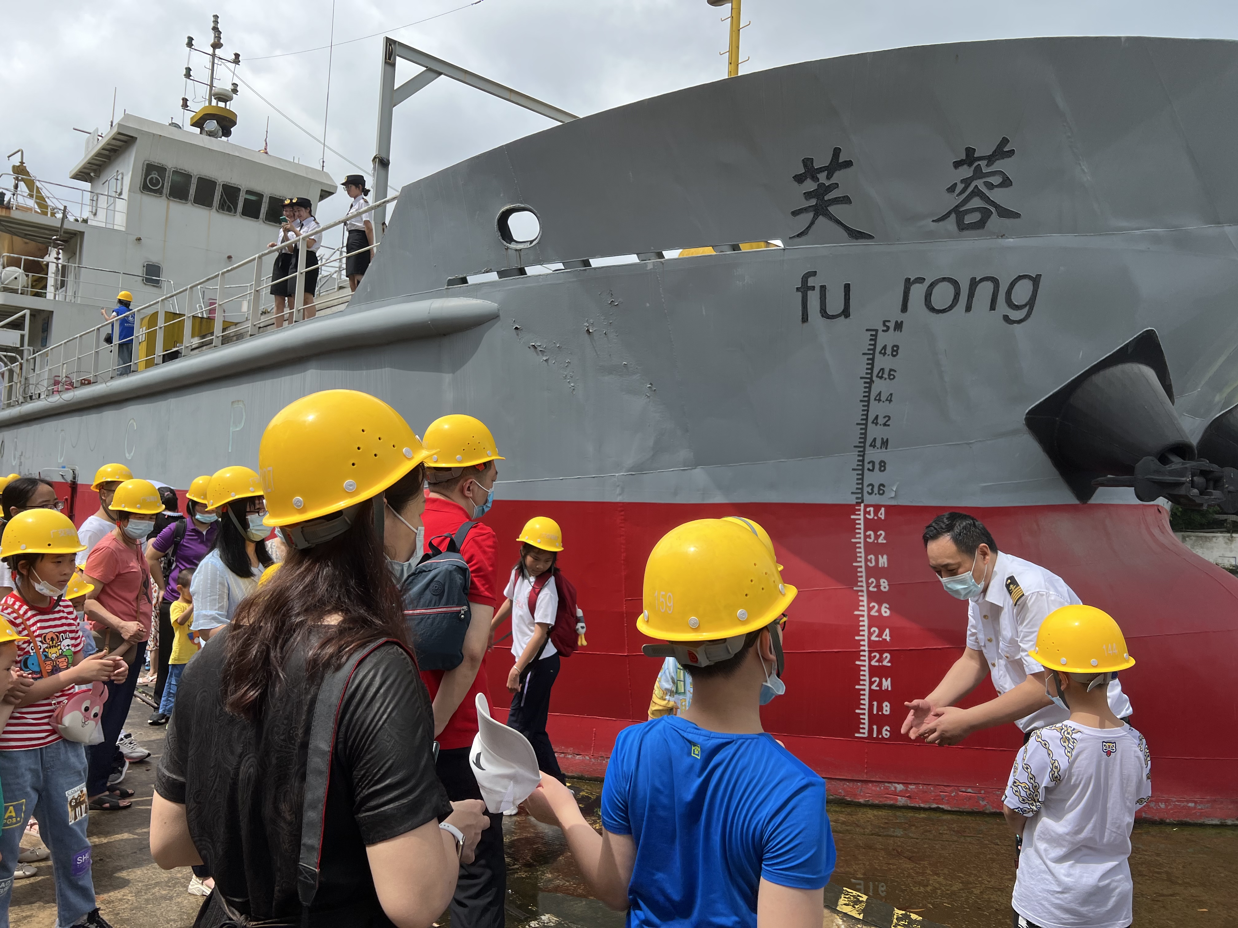 第四站:参观芙蓉号。登船的第一个步骤就是学习如何戴安全帽。登船前,讲解员向小朋友和家长们一对一教授戴安全帽的正确方法,所有登船人员按要求做好安全保护措施。讲解员一一介绍了“芙蓉号”船锚、船梯、甲板、驾驶舱等船体功能。