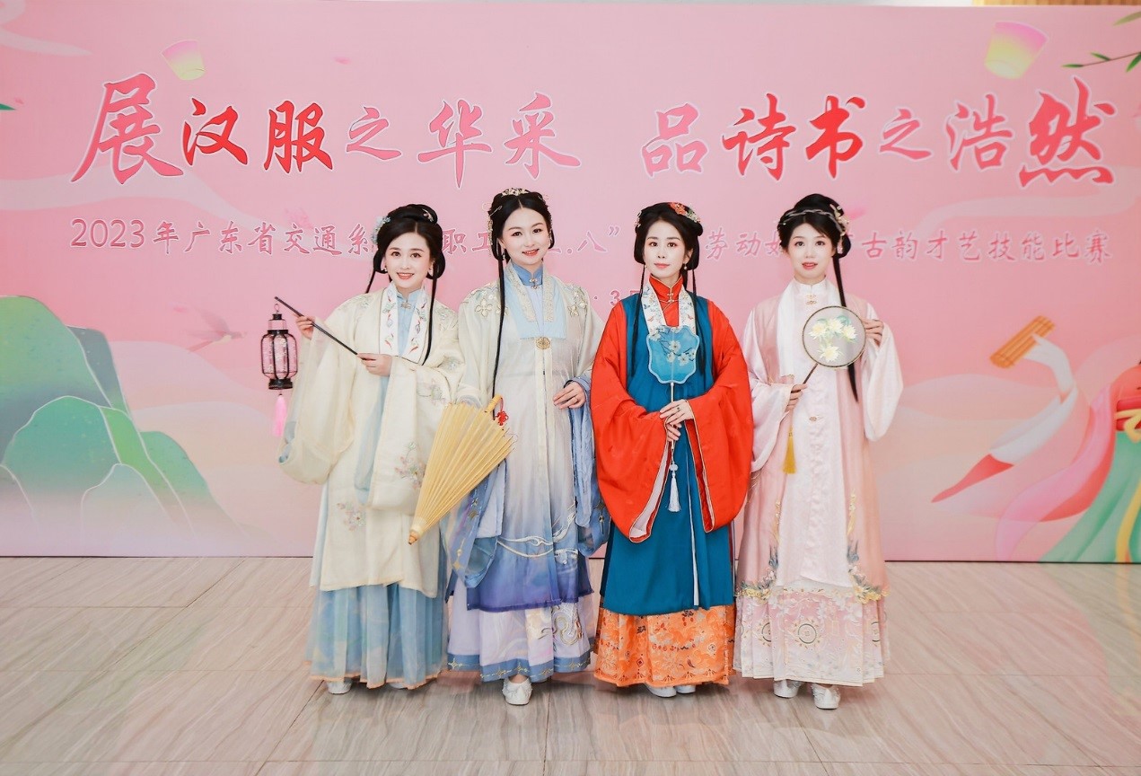 广东省交通工会举行2023年广东省交通系统女职工“展汉服之华采·品诗书之浩然”古韵才艺技能比赛,工会组织学院副院长、工会主席熊嘉逸、省工人先锋号团队负责人肖星组成的清梦队和女工委员张晨婧仔、郭新组成的花影队参加本次竞赛,经过礼仪、体态、造型、创意等多维度比拼,清梦队最终荣获一等奖。